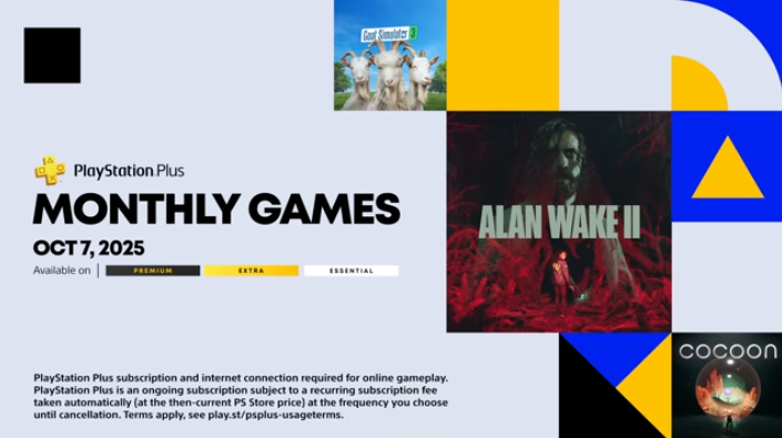 PlayStation Plus' free digital downloads for subscribers have been announced. If you're a member of the Essential, Extra, and Premium tiers, these will all be available to you on the PlayStation 5 and PS4 platforms. Exclusively for the PlayStation 4 are two titles; first, the action game from Coffee Stain Studios, Goat Simulator 3. And the puzzle adventure title from Geometric Interactive, it's Cocoon. And the lone PS5 title, it's the psychological thriller Alan Wake II, just in time for the holiday season.