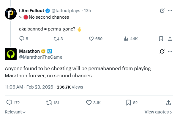 When a user on social media asked if "no second chances = perma-gone?", the Marathon official account repeated the policy.