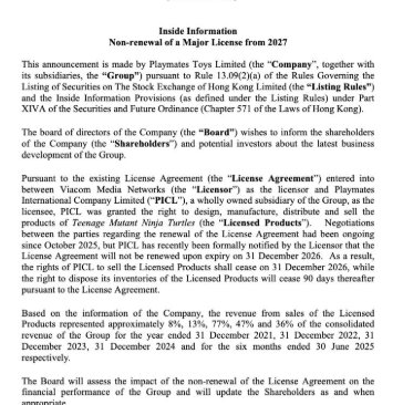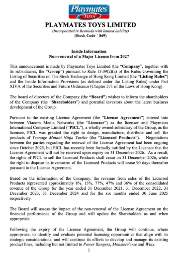 Negotiations between the parties regarding the renewal of the License Agreement had been ongoing since October 2025, but PICL has recently been formally notified by the Licensor that the License Agreement will not be renewed upon expiry on 31 December 2026. As a result, the rights of PICL to sell the Licensed Products shall cease on 31 December 2026, while the right to dispose its inventories of the Licensed Products will cease 90 days thereafter pursuant to the License Agreement.
