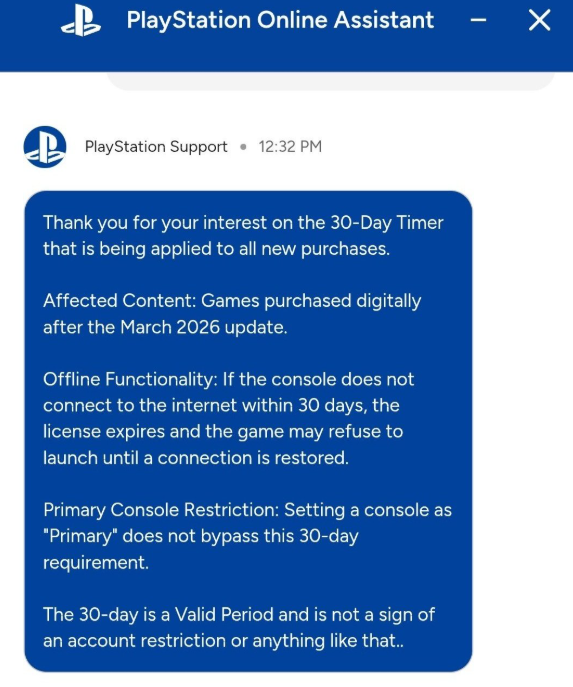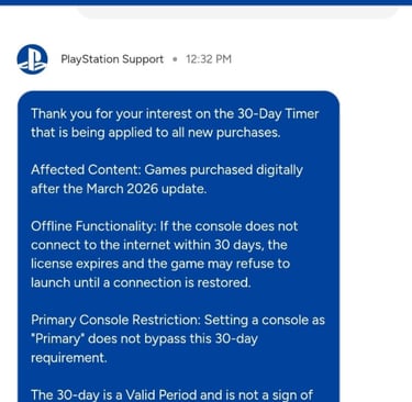 It now appears that what players have feared has been confirmed reality. According to HazzadorGamin, an account on Twitter/X, a fan asked PS Support about the 30-Day Timer "bug", and verified this will affect all digital purchases: