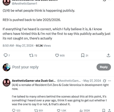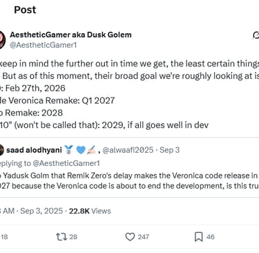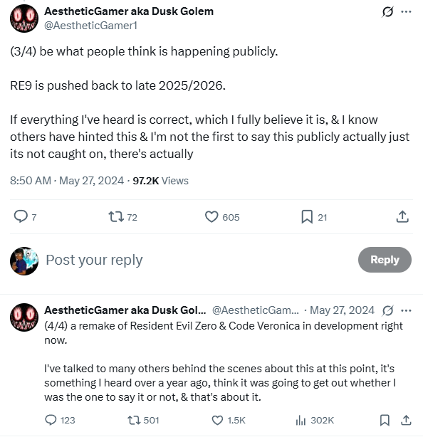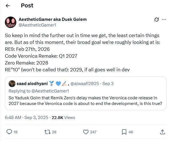 The reporting comes from MP1st, who has been corroborating information from 2024 that reveals remakes of Resident Evil: Code Veronica and Resident Evil Zero has been in the works. The source, Dusk Golem (a known reliable conduit of information regarding Resident Evil) highlights that the early plans for the two ground-up builds of the respective games were in motion, and RE9 would be pushed to 2025-26. Tweets were posted May of last year.