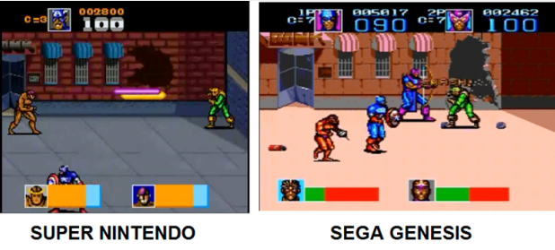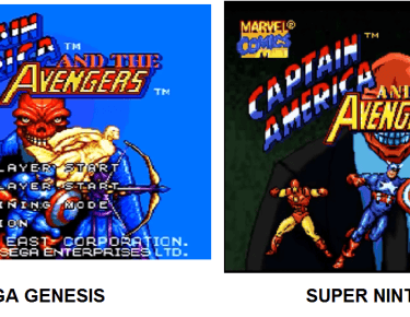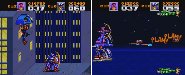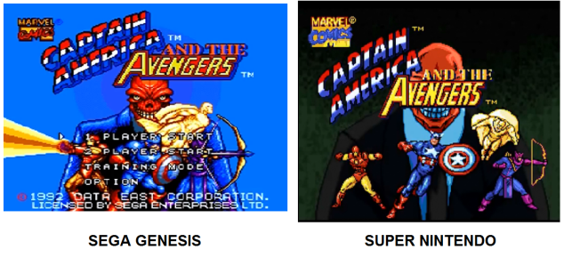 The Main Menu screens for both ports are cluttered in various degrees, but the Sega version put the heroes in more dynamic poses, whereas the SNES edition looks like each member of the team were cut and copied images from a different game altogether. What the hell is Hawkeye doing, is he a Quincy? You got to pull the bowstring, honey. Did you not see that because you weren’t wearing your BluBlockers from Avengers Assemble?