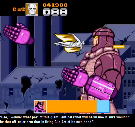 In between the brawling stages are shoot’em up portions, as you heroes take to the sky and gun down enemies. This is totally different from mashing buttons while evading enemies that are moving way too fast! I’m not sure how you are supposed to not take damage here. Shackling a sub-mediocre SHMUP to this doesn’t improve matters, since your projectile (other than Cap’s shield) doesn’t reach across the screen. You can pick up Wasp as a power up and launch her at the mess ahead to deal some extra damage, but you are too big a target to avoid a great of the mess that’s flying everywhere!! I do really like how Hawkeye and Cap can’t fly and have to rely on these hover carts. I got some unintended comedy out of that visual.