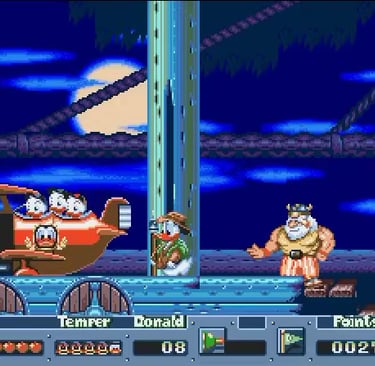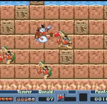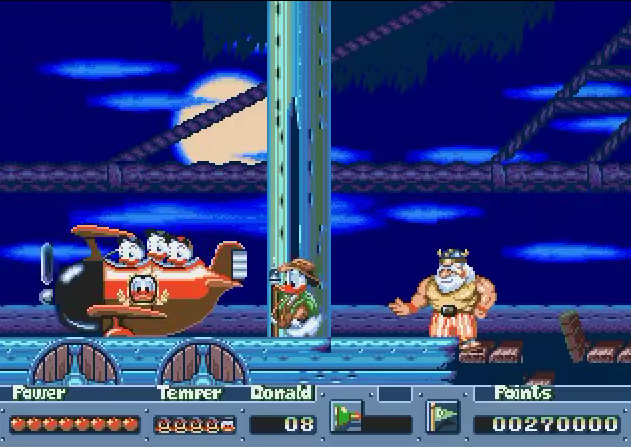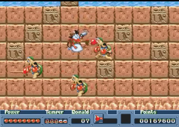 Visual puzzles like invisible walls are scattered about there and there, so be sure to keep a keen eye on shortcuts or potential stashes of popcorn ammunition. Another minor problem I have has to do with Donald’s size. As a much bigger sprite than say Mario or Mega Man, some of the bobby traps like harpoons and obstacles with awkward patterns seem a bit tricky to navigate around. At points in Egypt, tiny flames bounce around and above you, but due to the color scheme inside the pyramid, they can blend in with the stones or the background. it’s more of a nuisance than being difficult, but it gets a tad bit annoying, and an odd thing to complain about.