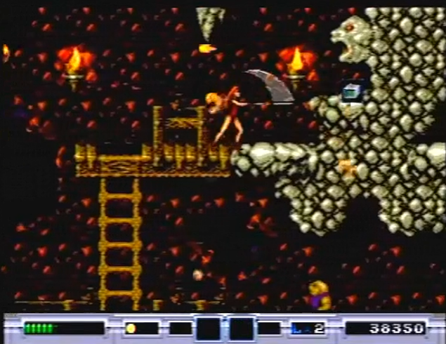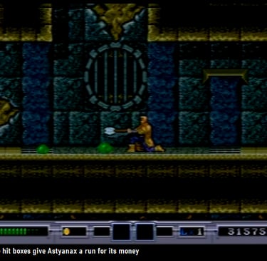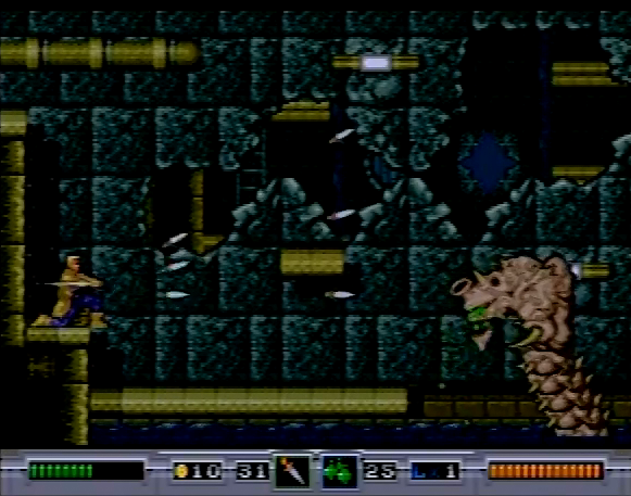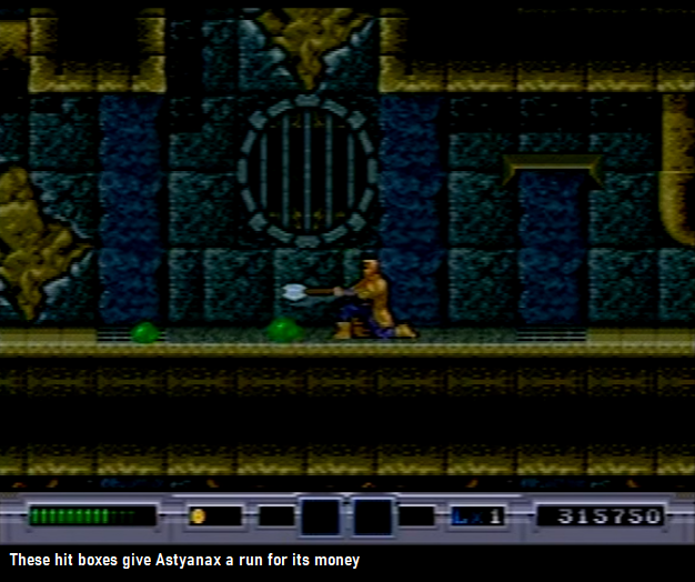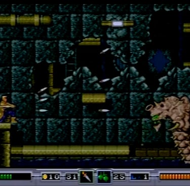 I can barely understand the witty remarks they utter (both Ackroyd and Shannon, at least based on this game, are unlikeable jackasses), and all of the enemies, whether you’re hitting a turret, a lion head, a pulsating wall blob, emit the same “Uergh!!” and “Uagh!!”. This makes Captain America & The Avengers on SNES sound like Super Metroid by comparison.