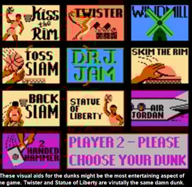 This Dunk Contest takes the cake for completely unresponsive implementation. Over the years, I never actually figured out how this was supposed to work or how the judges score it if you make it. From what I was able to understand, after selecting the dunk (which I'm assuming are Jordan's signatures?), you jump from a particular spot on the paint or the key, and then hit the A button when he's near the rim. It's definitely progressive, and it wasn't until NBA Live 2005 when a dunk contest would appear in a basketball video game. Maybe there was another, feel free to correct me. The dunks don't even look cool, but at least the icons provide some creative amusement.