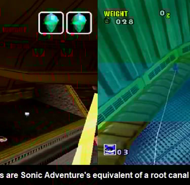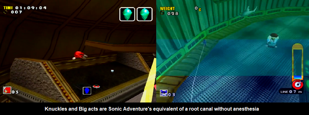 Amy's missions are, at the very least, incredibly linear and the easiest to play, but really aren't that fun. It's probably the closest Sonic Adventure gets to feeling like a balanced 3D platformer. Unfortunately, this is around the point of the game where my vision started to swim, and I could not wait for thesen portions to be over. Well, little did I know, the Amy Rose section of the game is probably an oasis of entertainment compared to Big the Cat and Knuckles' missions...