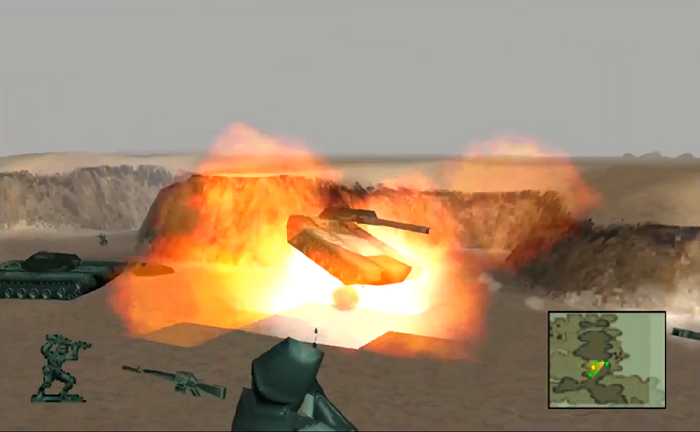 The character models, you'll never be close enough to them to get a good look at them, so how important should the dev team the accuracy of little plastic guys? The tan soldiers often blend in with the sand and dirt, so more than a few times, you'll have a hard time distinguishing between them and a jaggy outcropping until they start firing at you. The frame rate has mood swings, going form 50 to 15 as soon as action picks up. It's disappointing that the theme ultimately feels underutilized and this ends up being one of the brownest games in the PSX library. Your life bar is the little soldier toy holding up the bayonet, because I can't tell if this game lacks self-awareness or is completely full of it and is just screwing around with me.