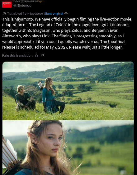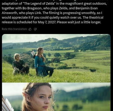This is Miyamoto. We have officially begun filming the live-action movie adaptation of "The Legend of Zelda" in the magnificent great outdoors, together with Bo Bragason, who plays Zelda, and Benjamin Evan Ainsworth, who plays Link. The filming is progressing smoothly, so I would appreciate it if you could quietly watch over us. The theatrical release is scheduled for May 7, 2027. Please wait just a little longer.